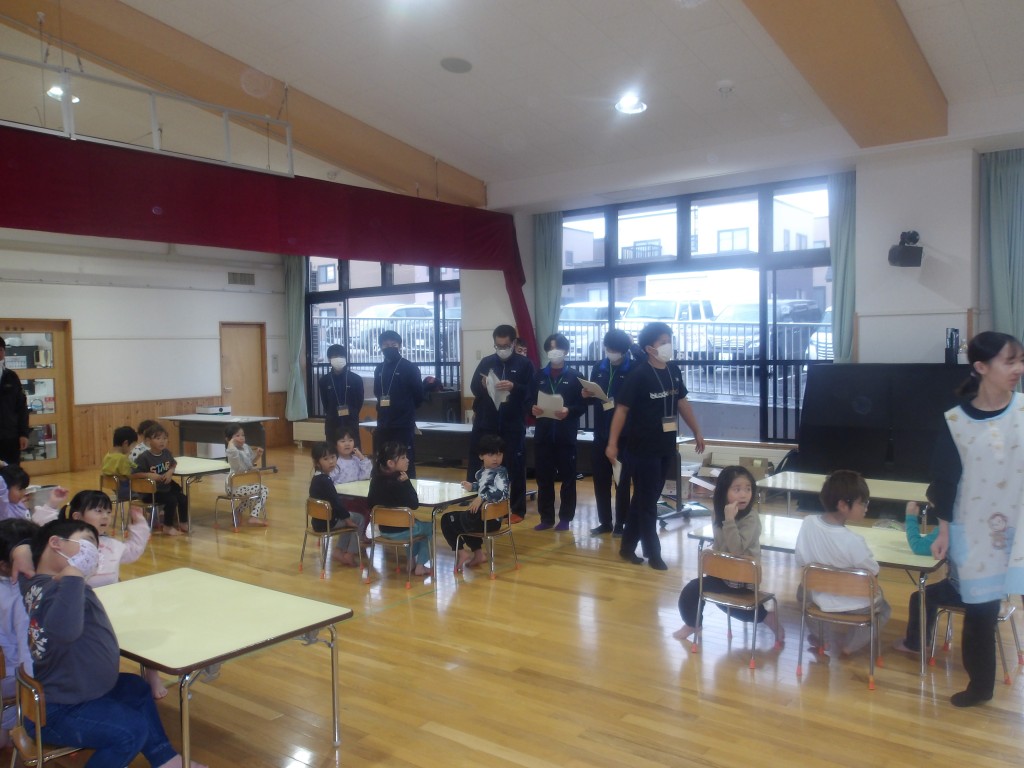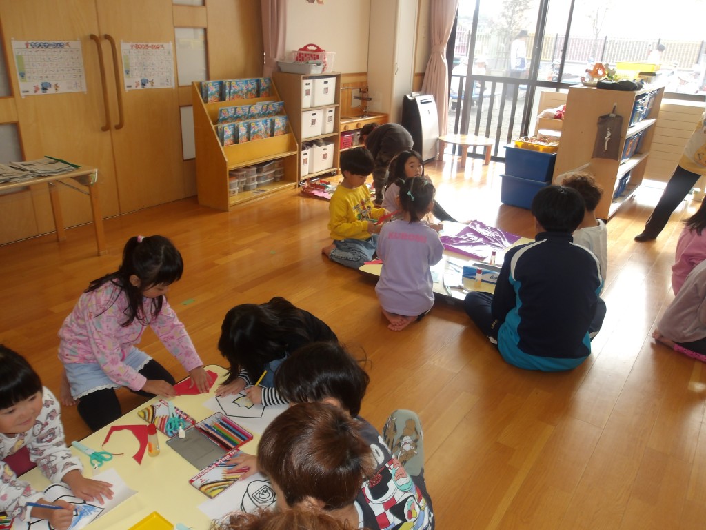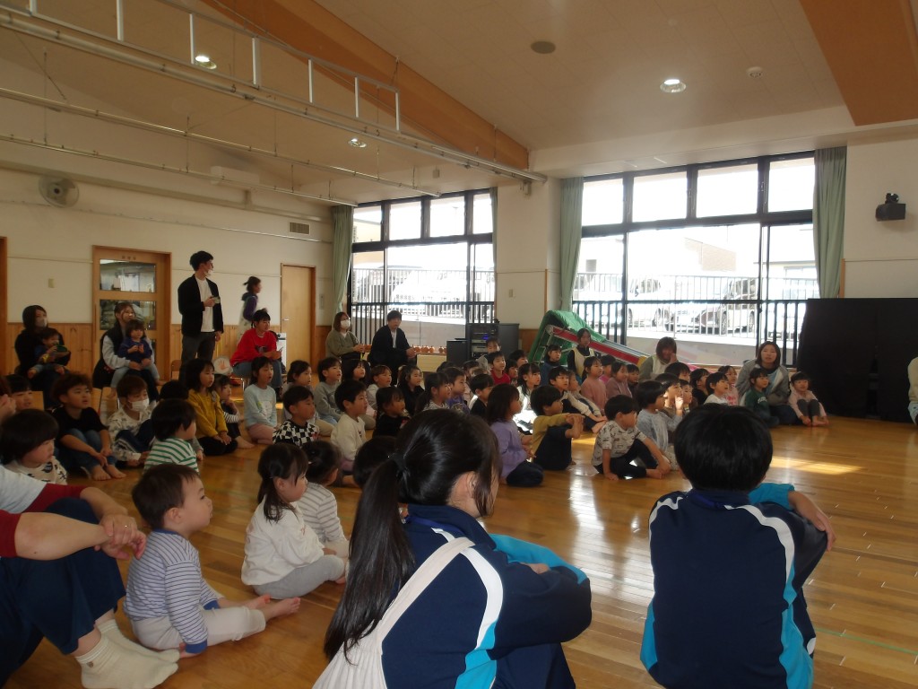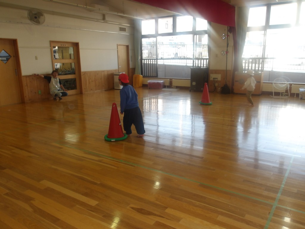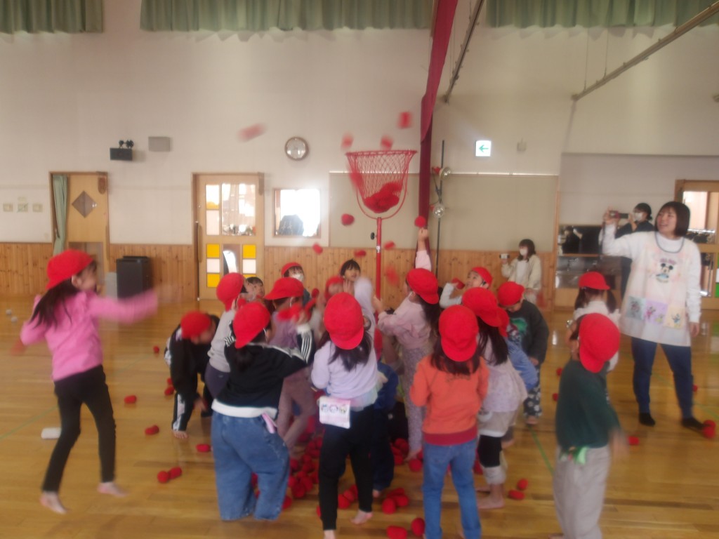 今月の誕生会がありました。11月に生まれた人は4人です。今回は「ミニ運動会」と題してみんなで体を動かしてお祝いをしました。まず、紅白玉入れをしました。いちご組さんはばいきんまん役の先生が持つかごの中に玉を入れる競技でした。その次は、りんご、れもん、ぶどう組の3クラス合同の玉入れをしました。1個の差で白組が勝ちました。その後同じ3クラスでリレーをしました。もも、いちご組は一生懸命う応援をしてくれました。