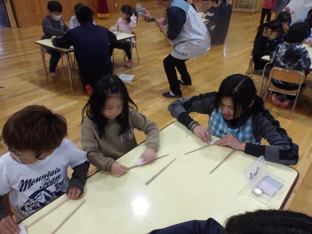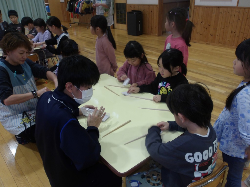 ぶどう組さんが岩見沢農業高校のお兄さんと木育(木を使って学習する)を行いました。今回は「箸」づくりでした。自分の好きな材質の木を選んでカンナや紙やすりで木片を箸にしていく結構たいへんな作業でした。でも子どもたちは楽しそうに木をごしごししていました。最後に蜜蝋をぬって仕上げました。高校生も一人一人の子どものペースに合わせて優しくていねいに対応してくれていました。