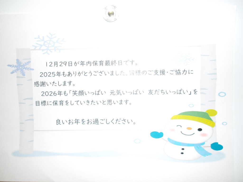 - 感染症対策マスク着用ご協力のお願い(R6,1,23付)をホームページ上にアップしました。上の公開資料から入っていただき、情報開示の中に表示しております。保育園では表示のような対応を継続して行ってまいりますので引き続きご協力の方よろしくお願い致します。