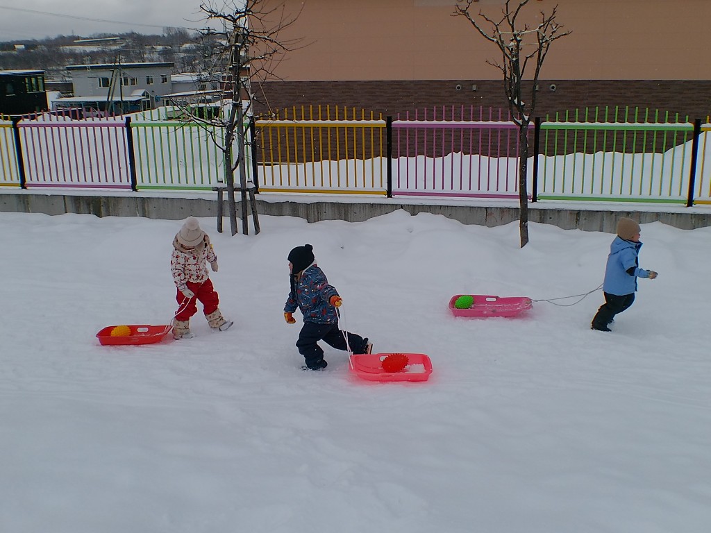 1月21日(水)雪中運動会を行いました。一つ目の競技はリレーでした。ボールを入れたソリを引きながら走りました。ソリからボールが転がり落ちているのに気づかず走っている姿が愛らしかったです。その後、みかん取り競争を行いました。みんな飛び上がって取っていました。本当は外で食べる予定でしたが、雪が降ってきたので教室で食べました。