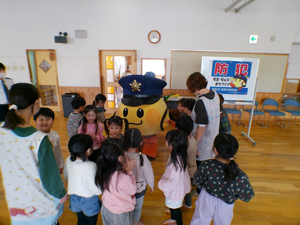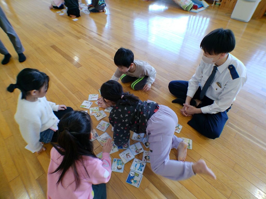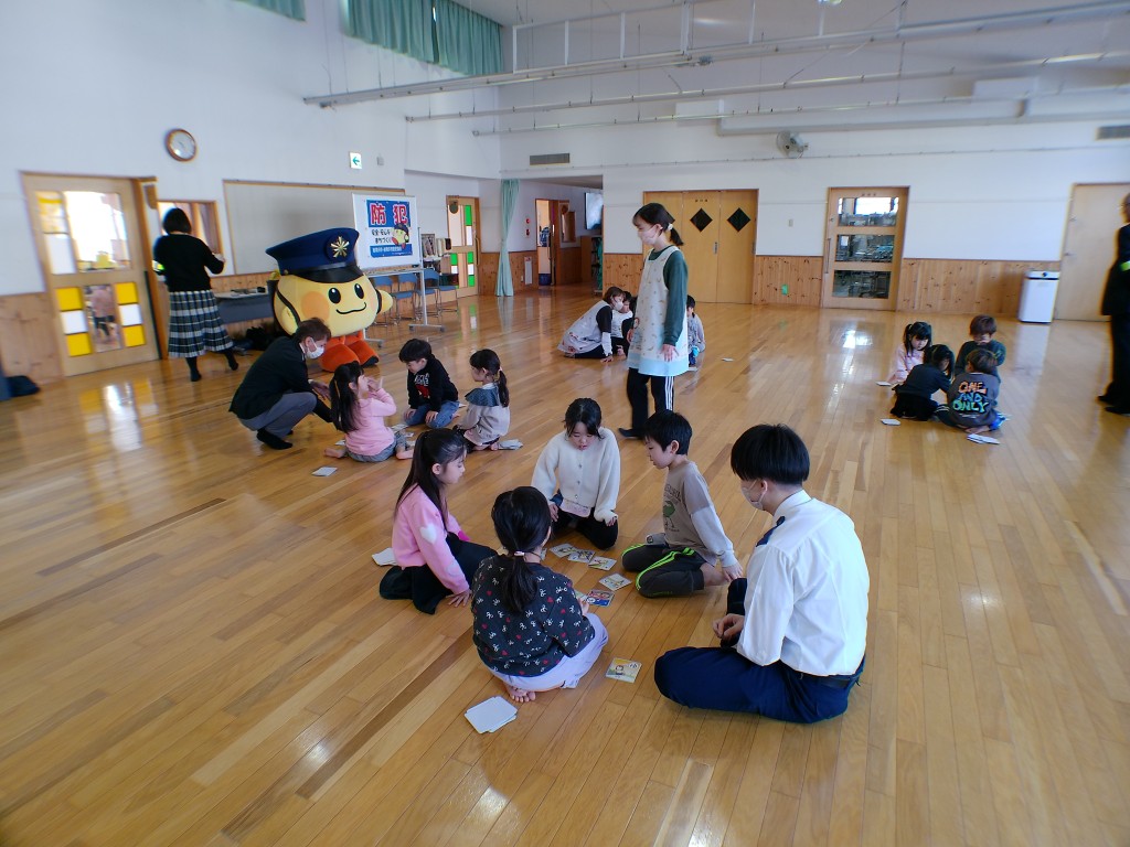 2月4日(水)ぶどうさんが4月から小学生になることから、岩見沢警察署や岩見沢防犯協会の方々かいらっしゃって防犯かるたを行いました。まず、生活安全課のおまわりさんから「いかのおすし」について詳しく説明していただきました。その後、グループに分かれて防犯かるたをしました。「はい」と大きな声を出しながら一生懸命札を取っていました。いわみ巡査も参加してくれました。