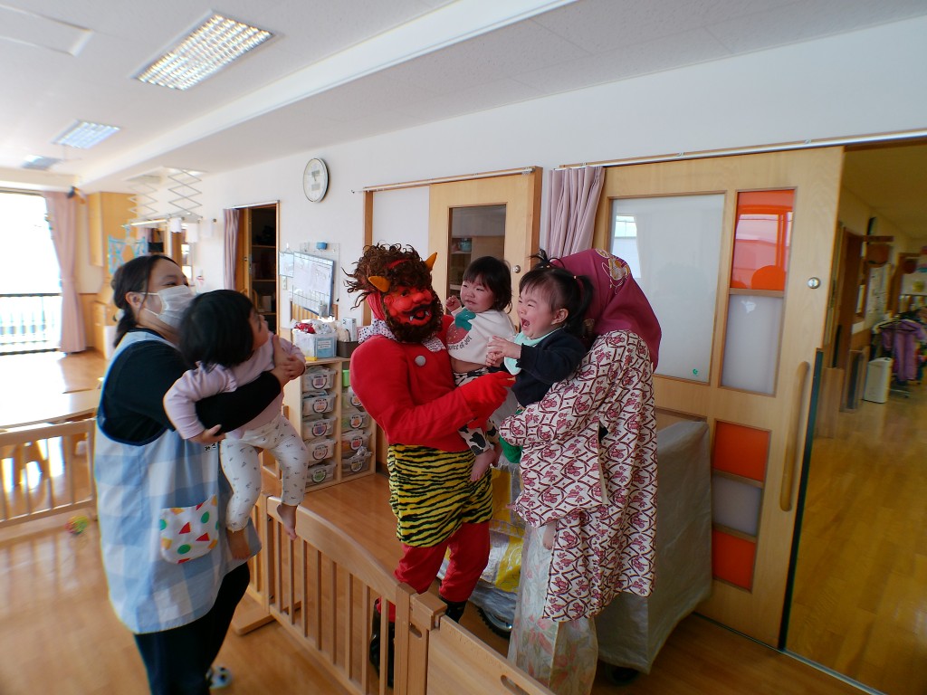 2月3日(火)節分豆まきを行いました。ホールに全員が集まり、節分についての説明やクイズに答えた後、手作りの帽子や入れ物を身にまとい、大きな赤鬼に向かって「鬼は外、福は内」と大きな声で叫びながら豆に見立てた紙ボールを投げました。その後、赤鬼と福 お多福が各教室をめぐりました。小さい子どもたちはギャンギャン泣いていました。給食も併せて紹介します。