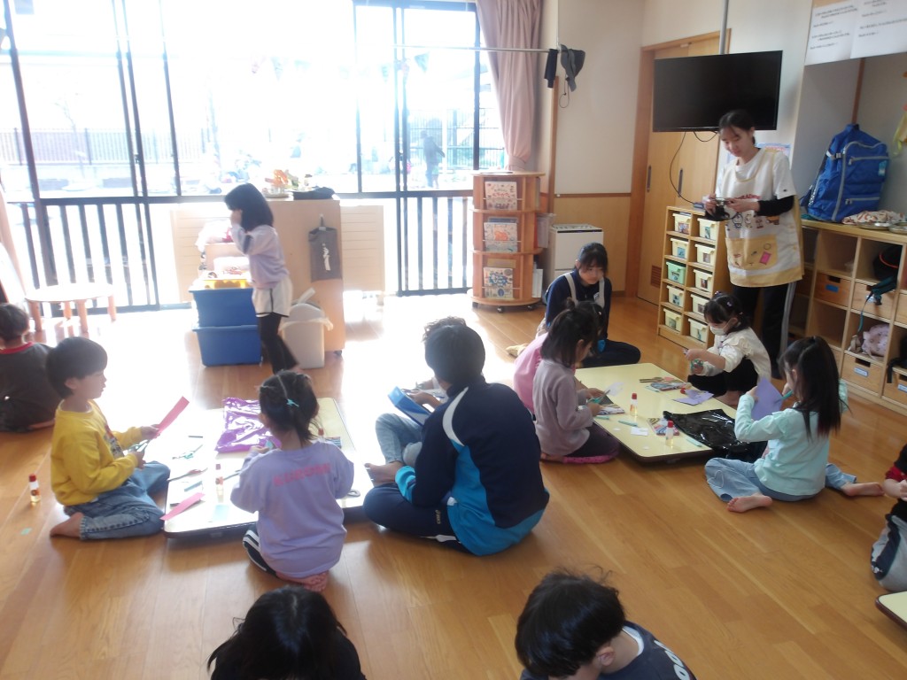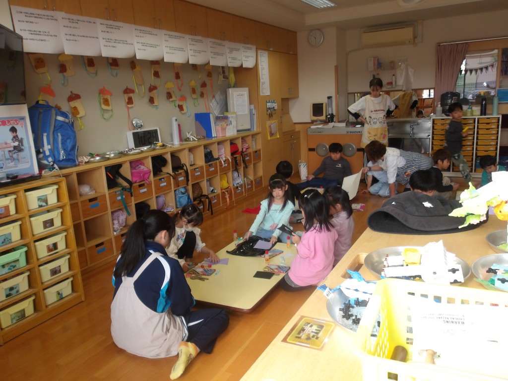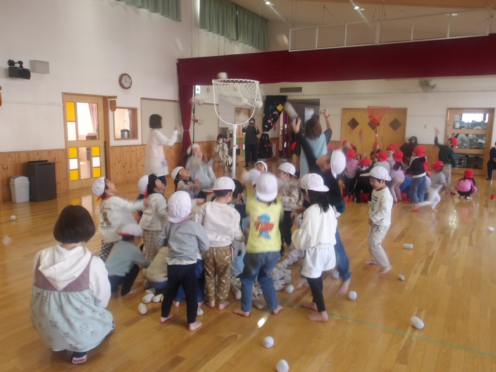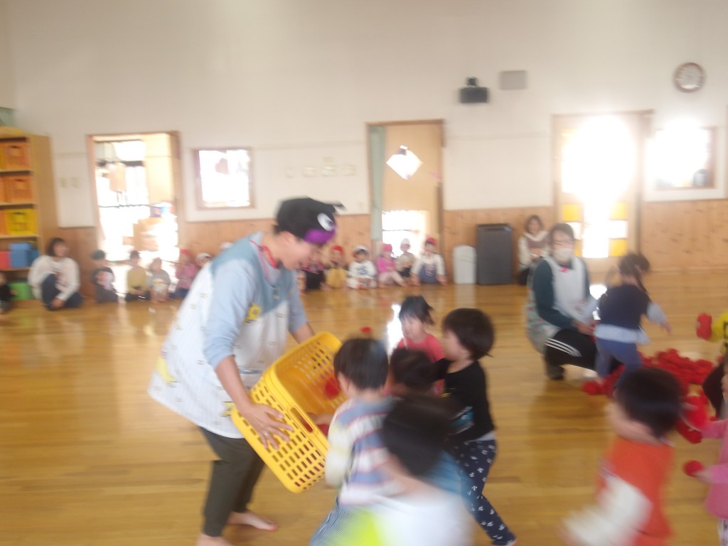 今月の誕生会がありました。11月に生まれた人は4人です。今回は「ミニ運動会」と題してみんなで体を動かしてお祝いをしました。まず、紅白玉入れをしました。いちご組さんはばいきんまん役の先生が持つかごの中に玉を入れる競技でした。その次は、りんご、れもん、ぶどう組の3クラス合同の玉入れをしました。1個の差で白組が勝ちました。その後同じ3クラスでリレーをしました。もも、いちご組は一生懸命う応援をしてくれました。