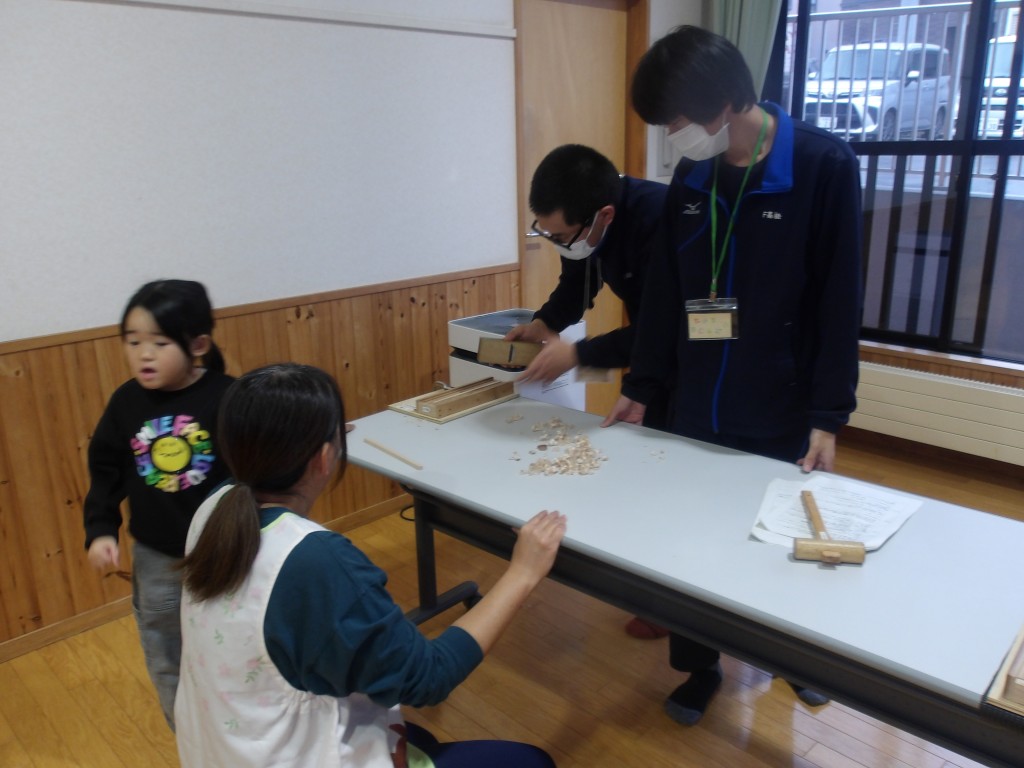 ぶどう組さんが岩見沢農業高校のお兄さんと木育(木を使って学習する)を行いました。今回は「箸」づくりでした。自分の好きな材質の木を選んでカンナや紙やすりで木片を箸にしていく結構たいへんな作業でした。でも子どもたちは楽しそうに木をごしごししていました。最後に蜜蝋をぬって仕上げました。高校生も一人一人の子どものペースに合わせて優しくていねいに対応してくれていました。
