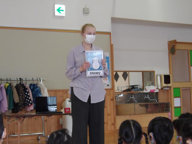 今日は「なかよし★英語」の日。メーガン先生が例えば”I do Rock 'と言った後、one-two-threeの合図で子どもたちがRock(グー)・Scissors(チョキ)・Paper(パー)のいずれかを出して勝負するジャンケンゲームやメーガン先生が英語で言った色と同じ色の物を探してタッチするゲームで大いに盛り上がりました。今回も、子どもたちは楽しみながら英語に親しむことができたようです。