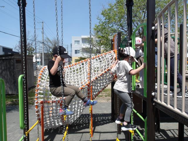 6月とは思えない肌寒い天候の中、楽しい楽しい遠足がありました。各クラスの目的地は、いちご組さんが日の出公園、れもん組さんがにれのき公園、りんご・ぶどう組さんがしらかば公園です。いつもの保育園園庭とはちがう空間で、子どもたちは花びらや木の実を拾ったり、原っぱを思いっきり駆け回ったりしていました。にれのき公園では、雲梯(うんてい)に挑戦するお友だちの姿が見られました。お昼近くになると、雲の隙間から日光が差し込んできました。暖かくなるといいな。