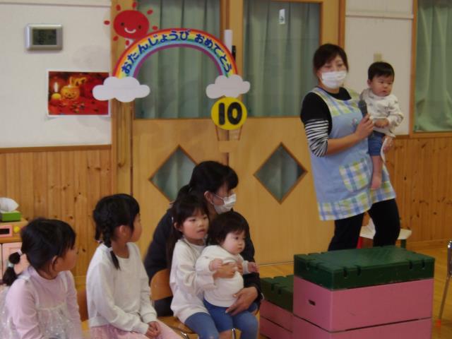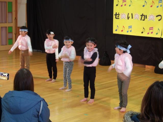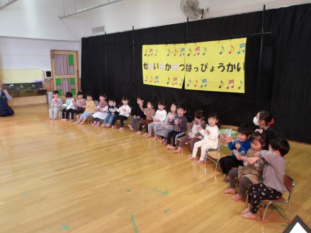 さくらんぼ・もも・いちご組とりんご・れもん・ぶどう組に分かれてゲーム「春よ来い 早く来い」を楽しんだ後、子どもたちが一堂に会して、3月のお誕生会が行われました。今月誕生日を迎える(た)のは8名のお友だちです。主役が会場に登場と同時に、園児の皆さんがその人のお名前を大きな声で呼ぶ光景を見ると、なんとも微笑ましい気持ちになりました。そして、お祝いする気持ちがこちらまで伝わってきました。やさしさいっぱい、終始ほのぼのとした雰囲気の中で会が進められました。もりもり食べて、ぐっすり寝て、元気に遊んで、大きくな~れ!