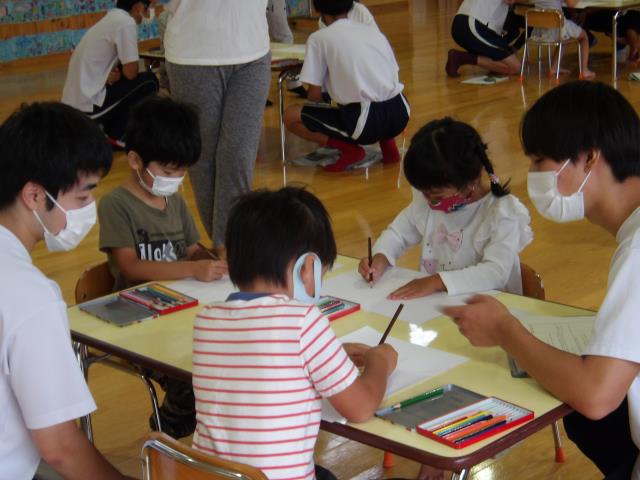 今年度3回目の出前授業です。今回は、「樹木に関する○×クイズ」と「落ち葉を使った貼り絵づくり」をしました。貼り絵に使った落ち葉は、高校生の皆さんが実際に拾ってきたものです。子どもたちはそれを思い思いに画用紙に貼りつけて、季節感たっぷりの作品に仕上げました。今年度の木育出前授業は、今回が最終回です。子どもたちは、高校生のお兄さん・お姉さんに感謝の気持ちを込めて、手づくりのキーホルダーをプレゼントしました。そして、最後は記念写真撮影です。木や自然についてたくさんのことを教えてくれた高校生のみなさん、ありがとうございました。