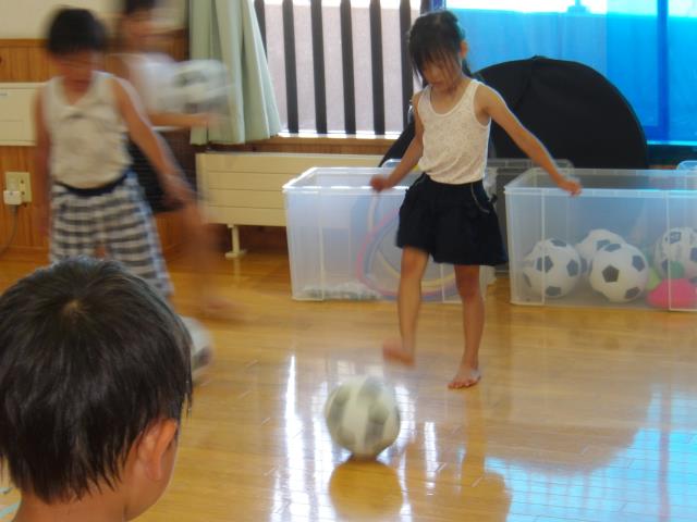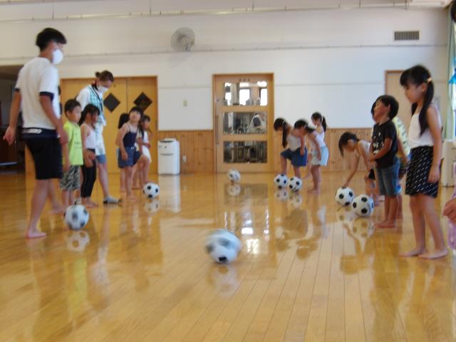 ◎一か月ぶりの「なかよし保育 ボール」です。子どもたちは大学生のお兄さんとボール運動に汗を流しました。最後は、サッカーゲームを思いっきり楽しんでいました。