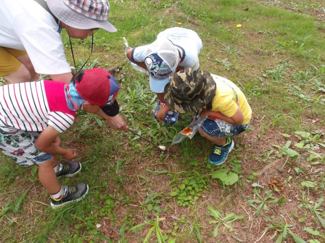 また、ミズナラの葉をさわったり、そのにおいをかいだり、ミズナラや正しい箸(はし)の持ち方に関するクイズに挑戦したり、ぶどう組のお友だちは学ぶことがいっぱいあったことでしょう。れもん組のお友だちも興味しんしん、木育教室の様子をじっと見つめ、途中から参加しました。高校生の皆さんは、この日のために前日遅くまで繰り返しリハーサルに取り組んだとのことです。ぶどう組のお友だちは、高校生の本気さ★真剣さを感じたことでしょう。貴重な時間を共有することができました。