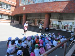 毎月実施している避難訓練、今回は、消防署の皆さんに来ていただきました。テラスに避難した後は、消火器の使い方について教えていただきました。ぶどう組、れもん組が、一人一人挑戦しました。ご家庭でも、火災には十分お気を付けください。