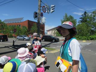 今年も岩見沢自動車学校のご協力をいただき、自動車学校で交通安全教室を開催していただきました。交通安全のお話を聞き、実際にコース上の横断歩道を歩きました。パトカーも来てくださったので、記念写真を撮りました。