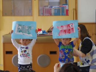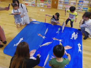 8月の誕生会でした。9人のお友達の中に、1歳を迎えたお子さん2名も、泣かずに参加できました。堂々と自己紹介する姿は立派でした。お話「おしゃれ魚のシャーナ」では、魚に見立てたペットボトルの水が、最後に、きれいに色水になって驚きました。