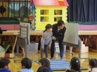 今日はクリスマス会でした。各クラスで作った飾りの紹介、人形劇グループ「ねぎぼうず」さんから「ぐりとぐら」の人形劇のプレゼント。みんな真剣でした。お昼は、手作りのサンドイッチ、タンドリーチキン、りんご、ジュース。おやつは、パフェでした。いいクリスマスになりました。