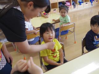 今月は、8名の皆さんの誕生会を行いました。インタビューと誕生カードのプレゼントの後では、今月の歌「山の音楽家」にちなんで、いろいろな楽器の紹介をしました。よく知っている楽器、初めて見る楽器、目を丸くして興味津々でした。給食は、星の飾りがついたチキンライス、ミートローフ、卵スープ、オレンジでした。とても美味しくいただきました。