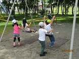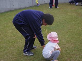 3歳児クラスでは、おにぎり作りに挑戦しました。手作りのおにぎりに旗を立てて完成です。少し大きめのおにぎりでしたがみんな残さず食べたそうです。ホールを使って、器具を使ったり、ゲームをしたりして楽しく過ごしたクラスもありました。