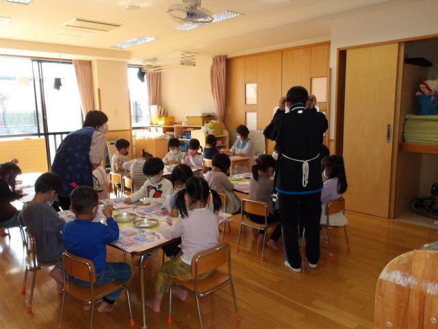 お天気が冬に戻ったみたいですが、0歳児も一緒になって「ひなまつり」をやりました。おひなさまの歌を歌って、ゲームで盛り上がりました。そして、お部屋に戻って《ひなあられ》をいただきました。給食もきれいでおいしかったです。