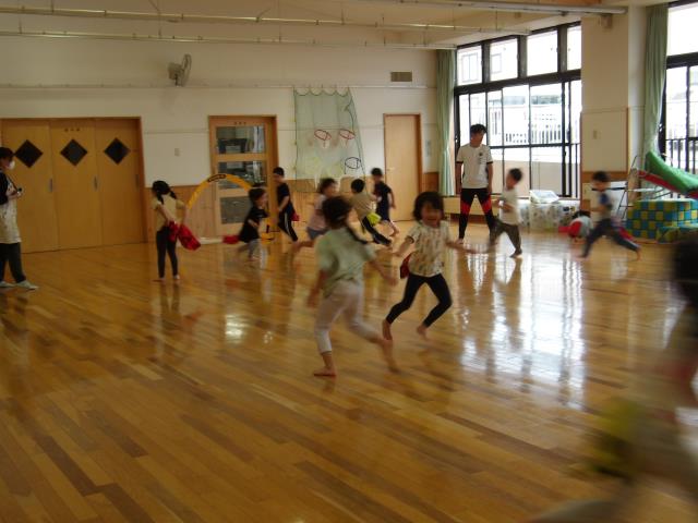 本年度最初の「なかよし」保育は、れもん組(4歳児)のジェニー先生の英語から始まりました。れもん組の18人は初めての経験とあって、緊張気味のスタートでしたが、ゲームが始まると元気いっぱいになり、夢中になって動き回っていました。来週からは、外部講師による体育とボール遊びも始まります。