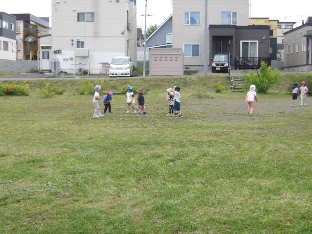 ボールとなかよしの先生は、岩見沢教育大学のサッカー部の学生さんたちです。5月から新しい先生が加わりました。かんたんなボール遊びからはじめて、最後には全員でサッカーのゲームをやりました。