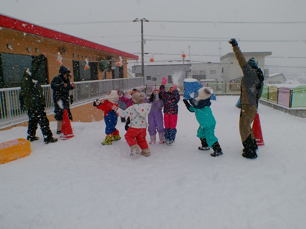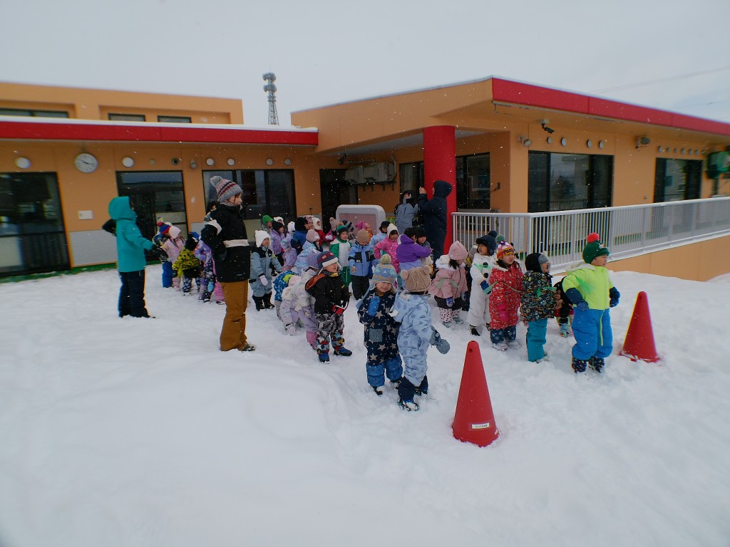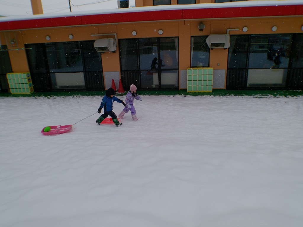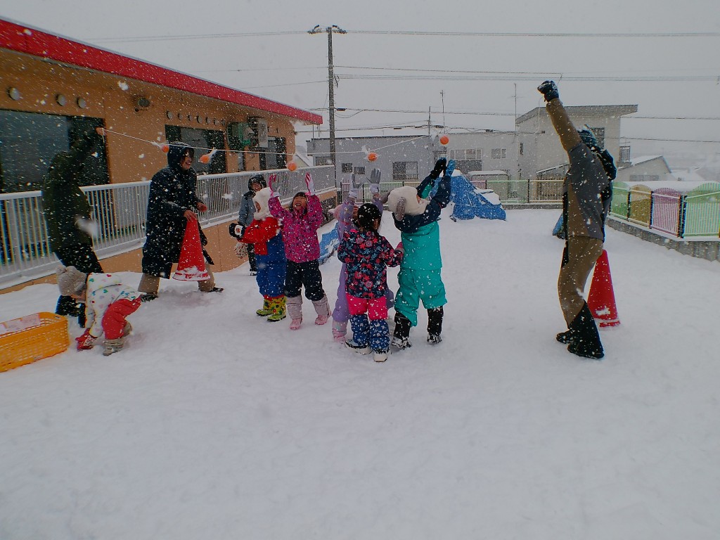 1月21日(水)雪中運動会を行いました。一つ目の競技はリレーでした。ボールを入れたソリを引きながら走りました。ソリからボールが転がり落ちているのに気づかず走っている姿が愛らしかったです。その後、みかん取り競争を行いました。みんな飛び上がって取っていました。本当は外で食べる予定でしたが、雪が降ってきたので教室で食べました。