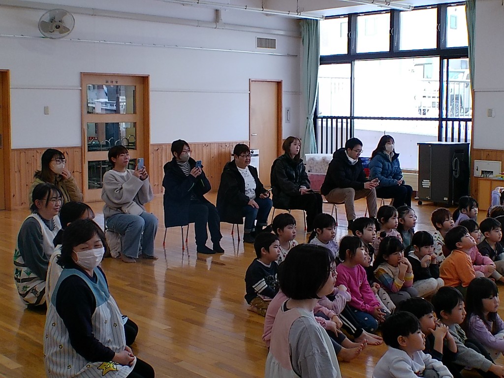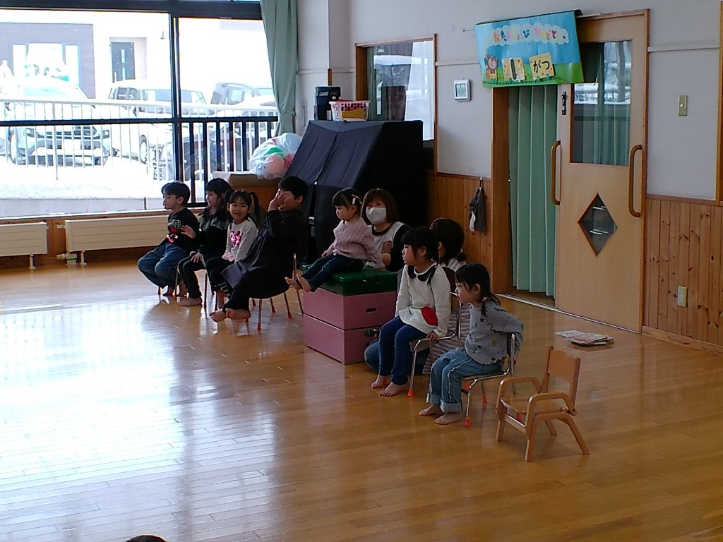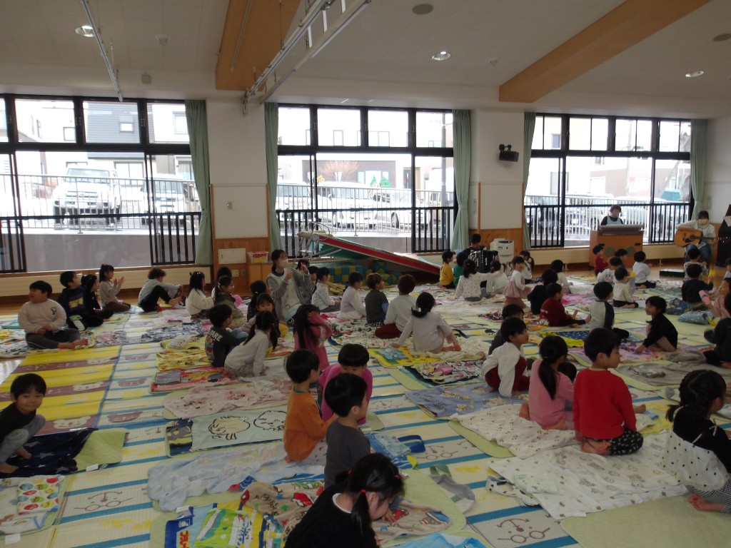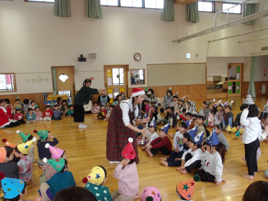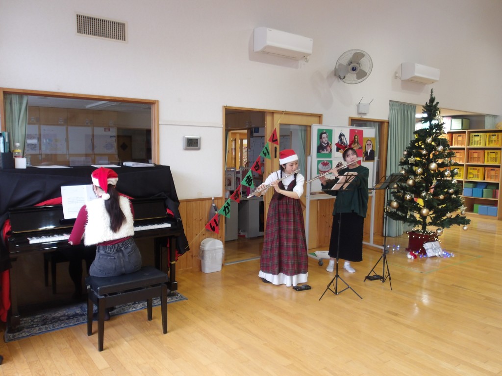 12月24日(水)、クリスマス会を行いました。今年はスペシャルゲストとして岩見沢教育大学の3年生3人に登場してもらい、フルートとピアノのアンサンブルでクリスマスソングを中心に5曲を演奏していただきました。子どもたちは手拍子を打ったり、一緒に歌ったりしてすごく喜んでいました。学生さんたちも子どもたちが楽しんでくれたのでとても嬉しかったです、とニコニコと話してくれました。その後、先生方も負けじと様々な楽器を持って合奏しました。明日の朝はうれしいプレゼントが届いていますように…。