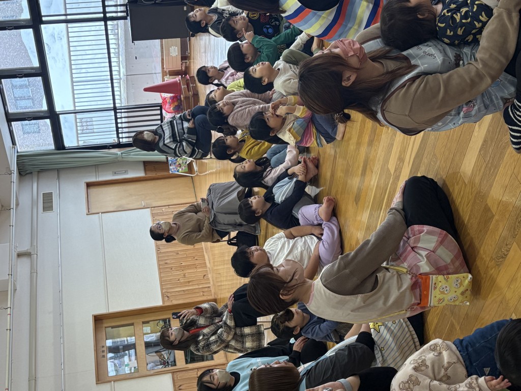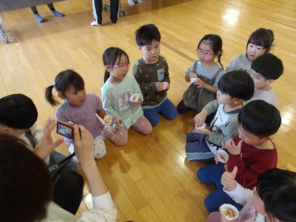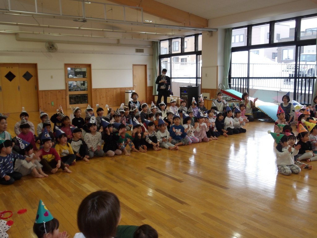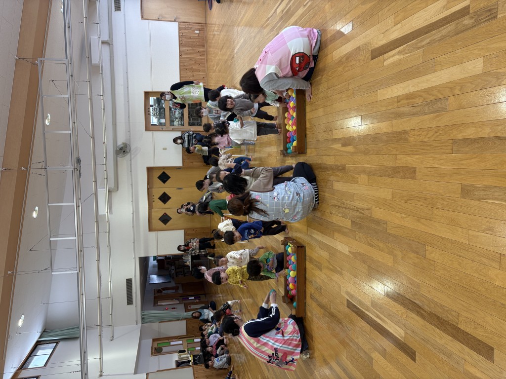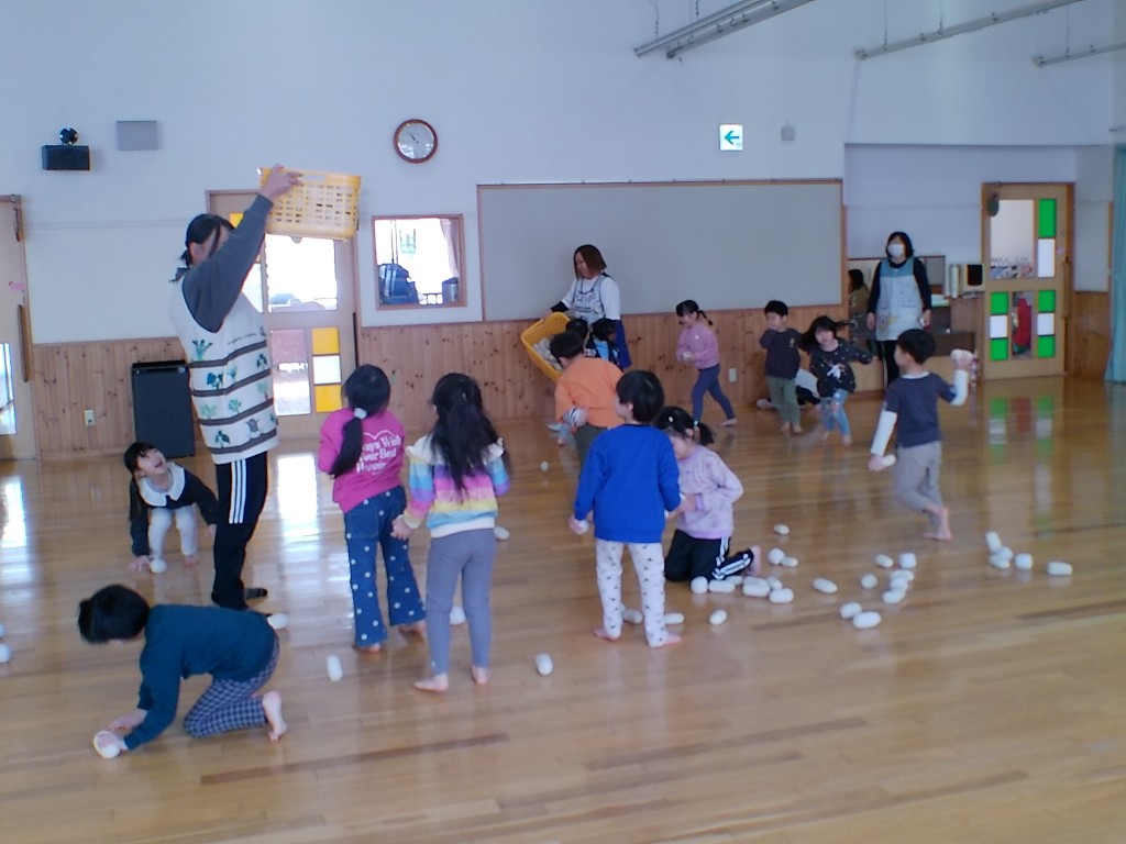 今月の誕生会がありました。11月に生まれた人は4人です。今回は「ミニ運動会」と題してみんなで体を動かしてお祝いをしました。まず、紅白玉入れをしました。いちご組さんはばいきんまん役の先生が持つかごの中に玉を入れる競技でした。その次は、りんご、れもん、ぶどう組の3クラス合同の玉入れをしました。1個の差で白組が勝ちました。その後同じ3クラスでリレーをしました。もも、いちご組は一生懸命う応援をしてくれました。
