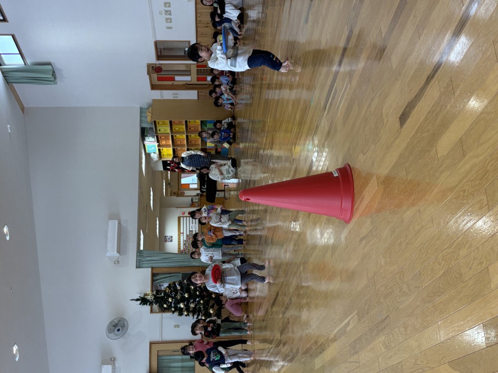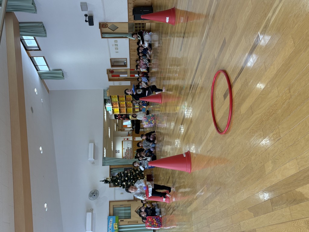 12月18日(木)に12月生まれの誕生日会を行いました。今月生まれの園児さんは少なく3名でした。それでも好きな色や食べものをしっかりと話してくれました。その後、クラスの月齢に応じた難易度でボールを使ったゲームをしました。みんな楽しそうに一生懸命がんばっていました。