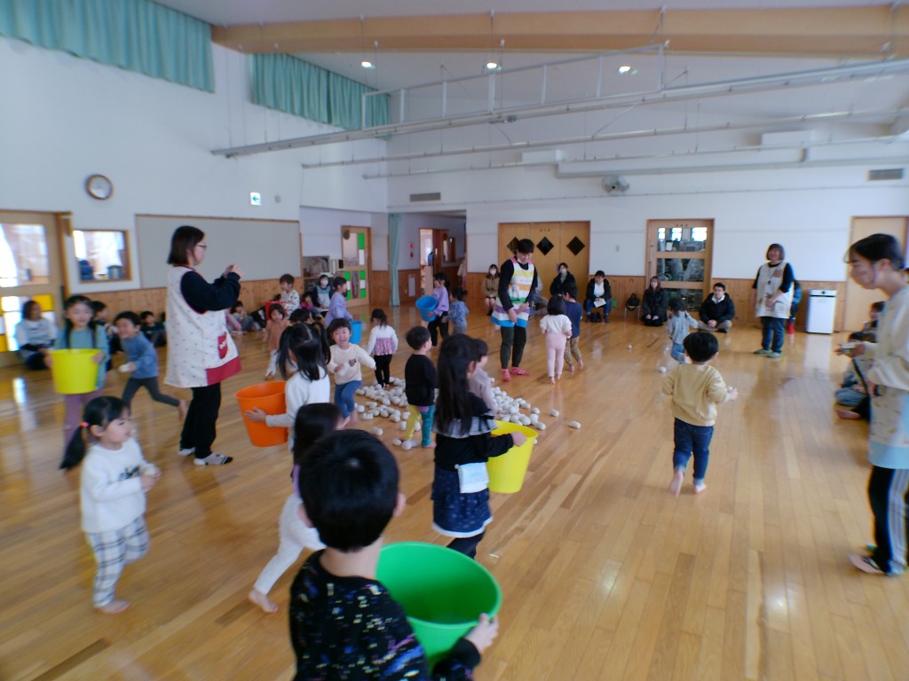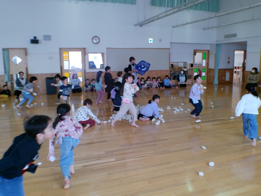 2月3日(火)節分豆まきを行いました。ホールに全員が集まり、節分についての説明やクイズに答えた後、手作りの帽子や入れ物を身にまとい、大きな赤鬼に向かって「鬼は外、福は内」と大きな声で叫びながら豆に見立てた紙ボールを投げました。その後、赤鬼と福 お多福が各教室をめぐりました。小さい子どもたちはギャンギャン泣いていました。給食も併せて紹介します。