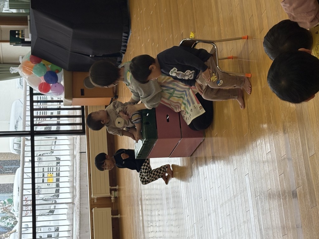 9月生まれの誕生会を行いました。6名全員が元気に参加してくれ、好きな食べ物や色、動物などをしっかり発表してくれました。その後、「リターンゲーム」といって、アンパンマンとばいきんまんが表裏に描かれたオセロようなでっかい円盤を2組に分かれて裏返しあうというゲームをしました。もも組さんたちはルールがわからないようでただ持って楽しんでいる様子でしたがぶどう組さんたちは競って裏返していました。