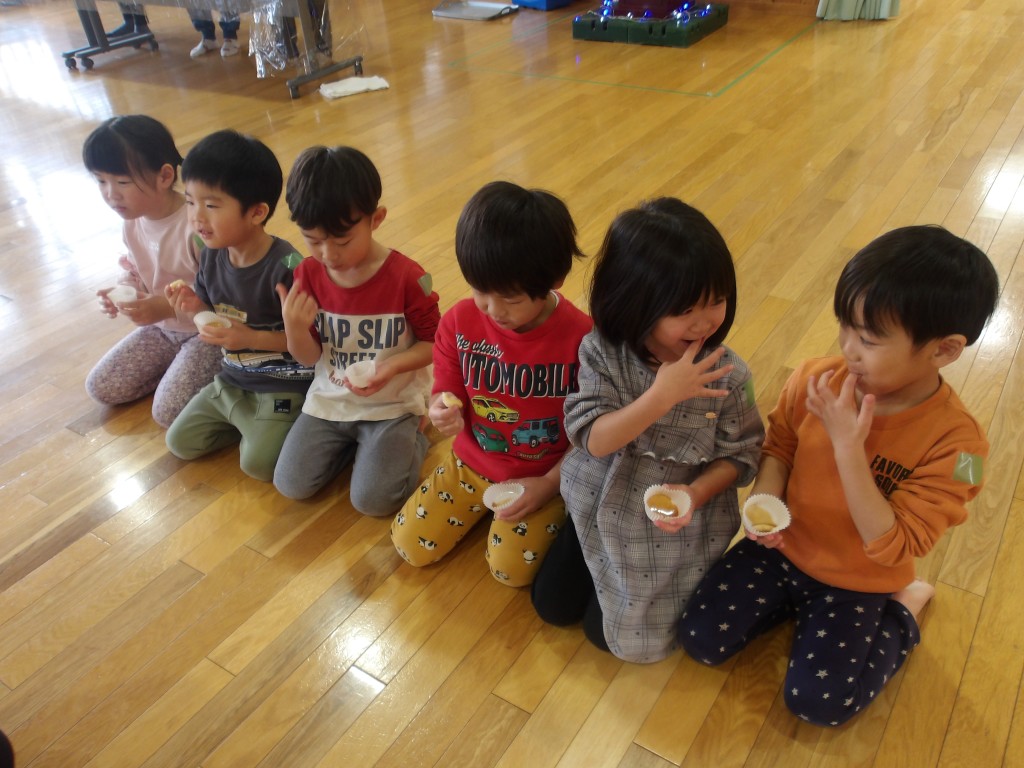 1月生まれ7名の誕生日会を行いました。それぞれの好きな食べ物や動物を発表し、写真や手形がとじこんだ色紙をもらいました。その後、みんなで「追いかけ玉入れ」を行いました。さくらんぼとももさんは、ぶどうさんたちが持つかごに玉を入れ、りんごとれもんとぶどうさんは、先生がもつかごに玉を入れました。子どもたちは走ることが大好きです。キャッキャ言って走り回っていました。完全給食の写真も掲載します。