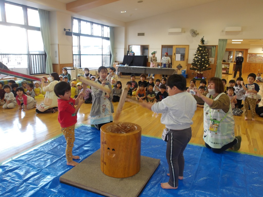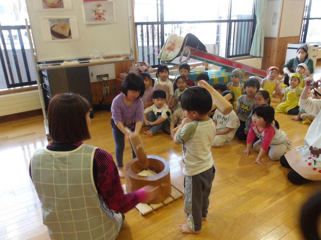 12月3日(水)にお餅つきをしました。先生の方から簡単に餅つきの由来や意味合いについて説明があった後、先生方がデモンストレーションでつき、その後子どもたちが代わるがわるつきました。つきあがった餅は鏡餅用に成形され、子どもたちは事前に準備してあったお餅を砂糖醤油で食べました。